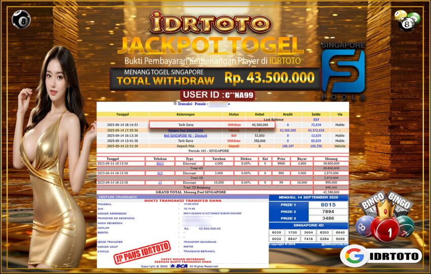 IDRTOTO JACKPOT PERMAINAN TOGEL SINGAPORE POOLS Rp.43.500.000 – LUNAS