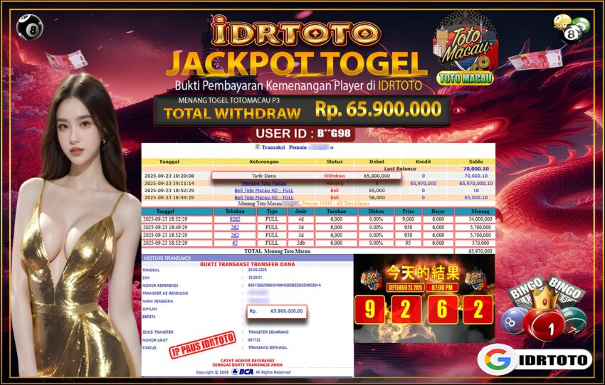 IDRTOTO BAYAR LUNAS JACKPOT PERMAINAN TOGEL TOTO MACAU P3 Rp.65.900.000 – LUNAS