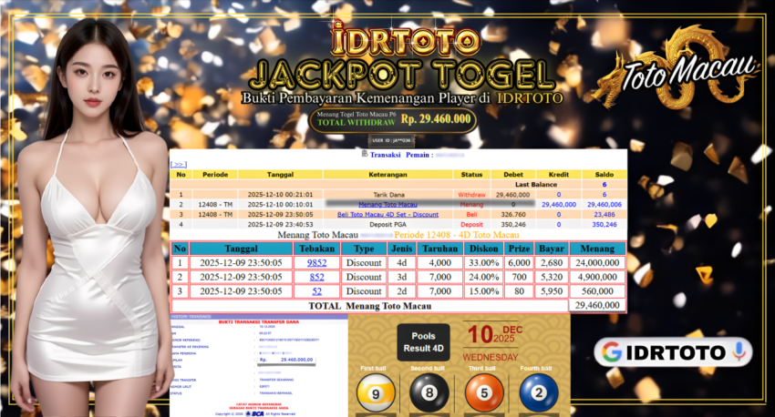 IDRTOTO BAYAR LUNAS JACKPOT PERMAINAN TOGEL TOTOMACAU P6 Rp.29.460.000 – LUNAS