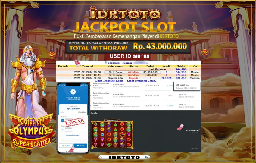 IDRTOTO BAYAR LUNAS JACKPOT SLOT GATES OF OLYMPUS SUPER SCATER Rp.43.000.,000 – LUNAS