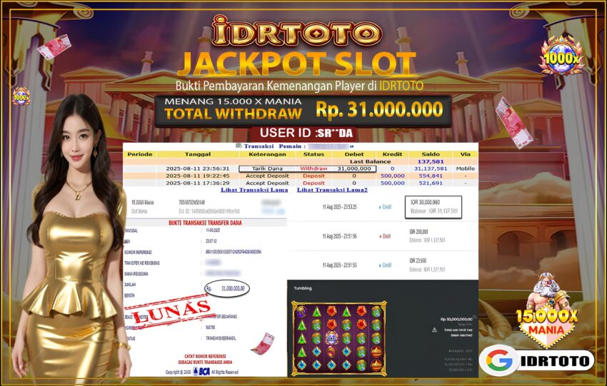 IDRTOTO BAYAR LUNAS SLOT 15.000 X MANIA Rp.31.000.,000 – LUNAS